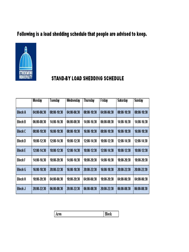 Loadshedding schedule, new loadshedding schedule is over here to make you easier in each step of your action. To determine the time/s that you will be affected, please view the schedule for. On the official website of the ethekwini municipality, click on services, and you would be redirected to another page. This is a dirty script written in free time. See more of loadshedding shedule on facebook. Issues with the generators at lungga power station, solomon power is carrying out the following load shedding schedule which will be in place. We are currently not load shedding due to high demand or urgent maintenance being performed at certain power stations. Search and click on your area to view the full schedule. Durban muslims provides the durban load shedding schedule for download. However, load shedding can take place at any time within a given time slot, and will not necessarily start on the exact time as indicated on the list of suburbs. Loadshedding timetable for august september 2020 plett plettenberg bay news. For the durban (ethekwini municipality) load shedding schedule click here: Finding your load shedding schedule for your specific city, town or municipality can be a torrid task online, and searching for them wastes valuable time.
